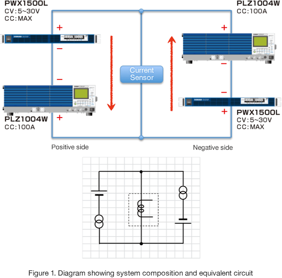 By using DC power supplies (the PWX1500L) to supply the positive and negative current combined with an electronic load (the PLZ1004W), the system is able to supply a current sensor with both positive and negative current (at 100A) without using a switching device (Figure 1).